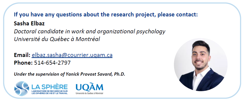We are pleased to invite you to participate in a study that is the result of a collaboration between the Fédération du personnel de soutien scolaire (FPSS-CSQ) and the Research Laboratory on Spheres of Life and Work (UQAM). The study focuses on evaluating psychosocial risk factors, with a focus on the role of social support and work-family balance.
